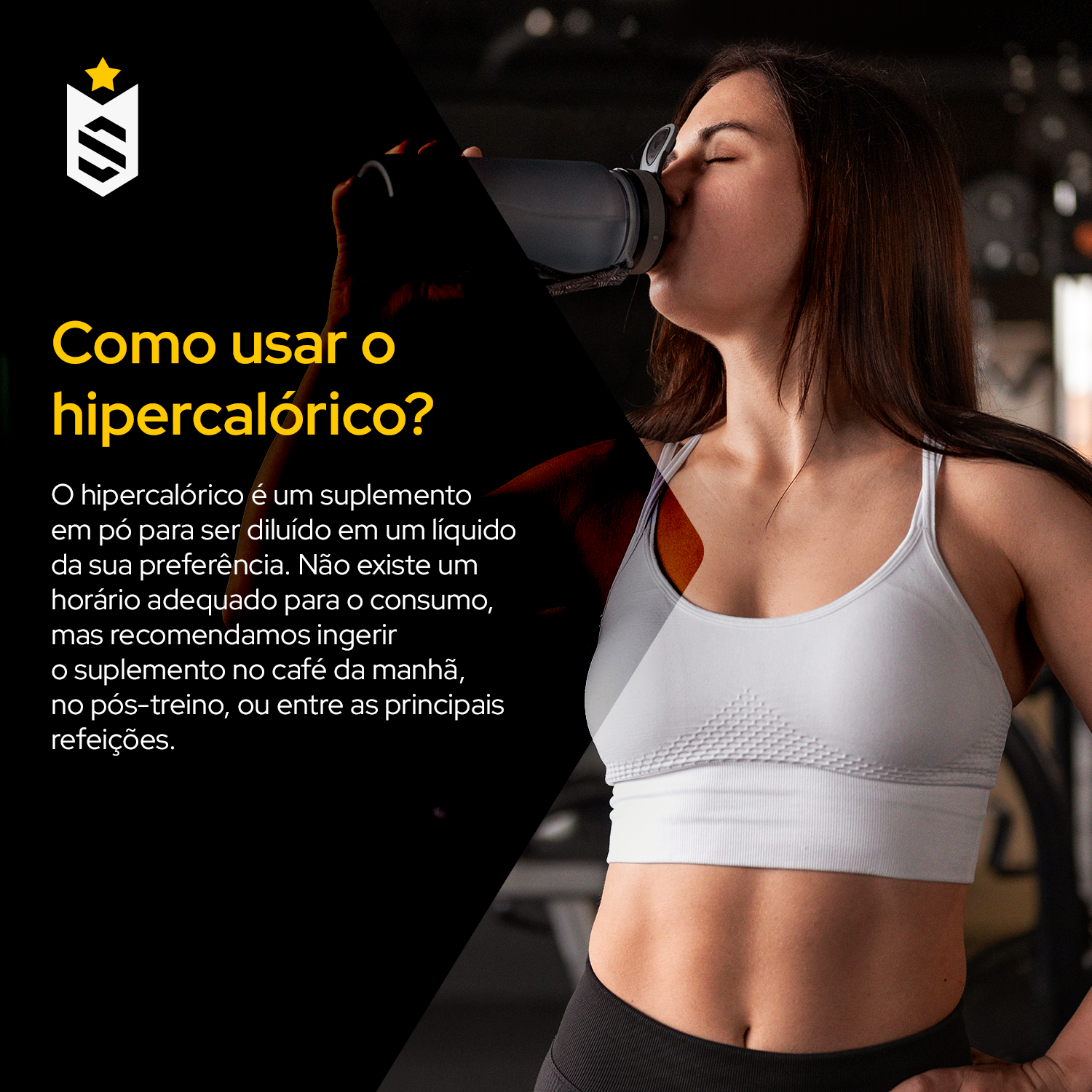 O hipercalórico é um suplemento em pó para ser diluído em um líquido da sua preferência. Não existe um horário adequado para o consumo, mas recomendamos ingerir o suplemento no café da manhã, no pós-treino, ou entre as principais refeições.