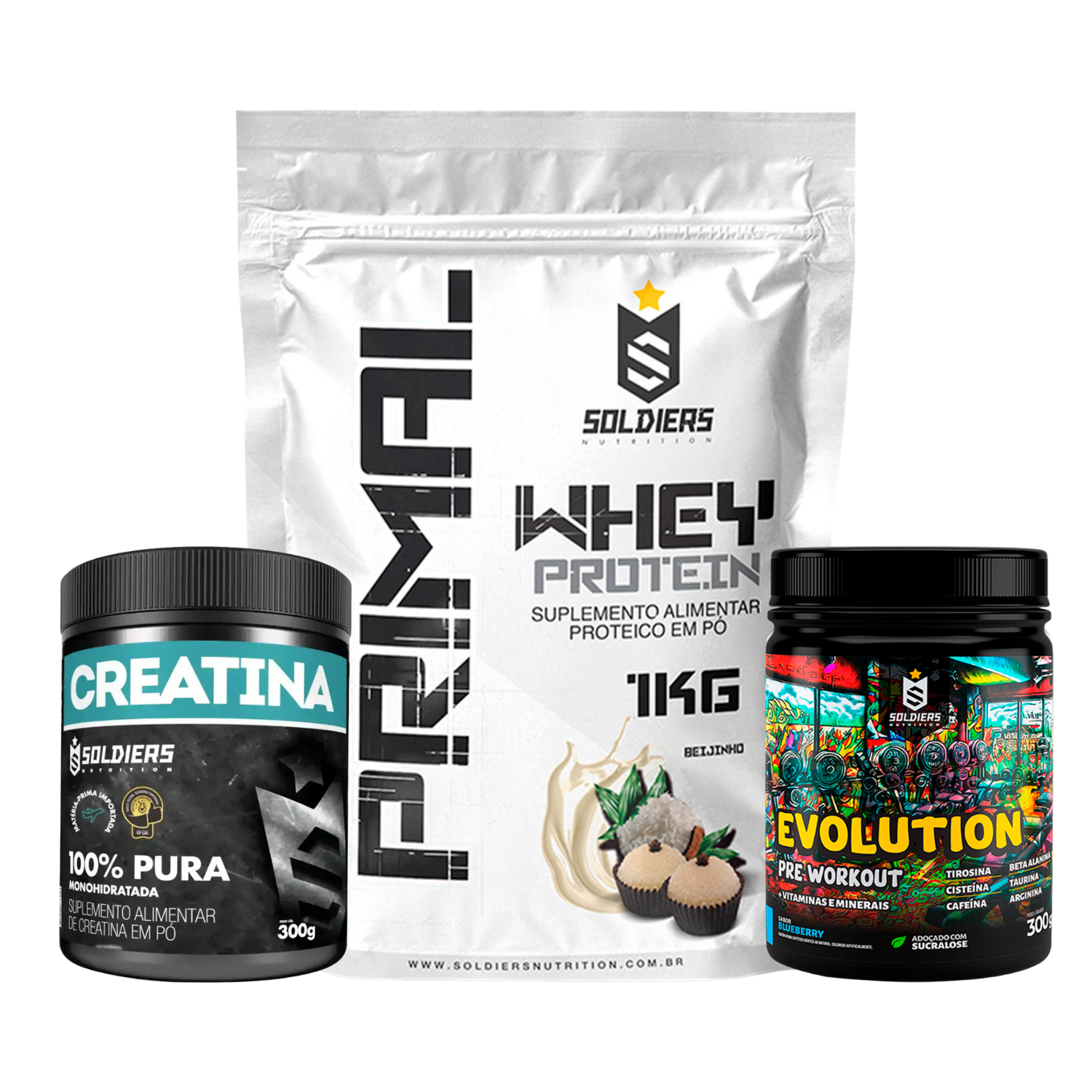 Kit Whey Primal 1Kg + Creatina 300g + Pré-Treino Evolution 300g - Soldiers Nutrition